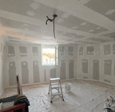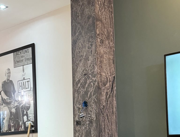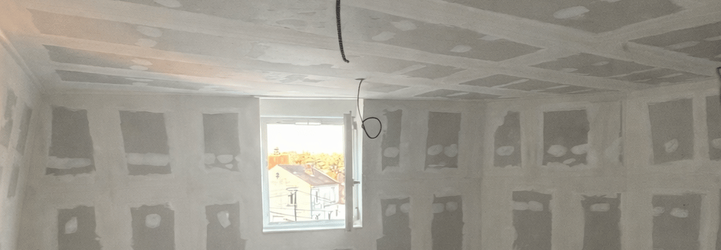 Cloisons, plafonds et volumes sont réalisés avec précision pour garantir des supports droits, solides et durables. Le collage des bandes, étape essentielle et déterminante, assure des jonctions nettes et invisibles. Un travail mal exécuté à ce stade peut entraîner l’apparition de spectres de bandes, souvent causés par un enduisage insuffisant ou irrégulier des jonctions en plaques de plâtre. C’est pourquoi chaque détail est maîtrisé avec rigueur, car la qualité de la plâtrerie conditionne directement le rendu final des finitions.
