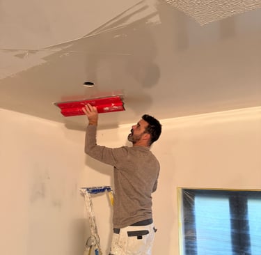 Après une plâtrerie soignée, chaque surface est minutieusement préparée, corrigée et lissée afin d’éliminer les moindres défauts. Ce travail de précision permet d’obtenir des supports parfaitement uniformes. Une étape discrète mais cruciale, qui révèle la qualité du travail en amont et prépare le terrain pour une finition irréprochable.